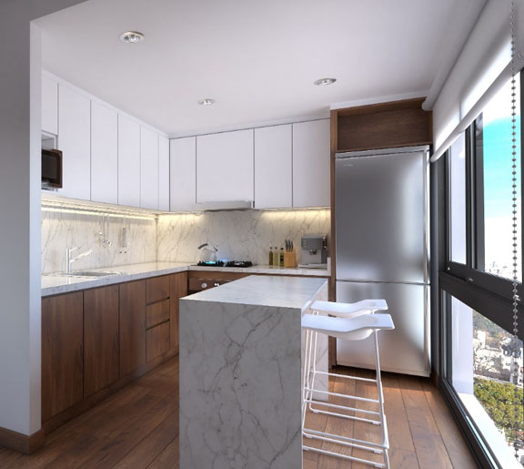 Agua caliente centralizada por sistema de termotanques de alta recuperación. Baños equipados con artefactos Ferrum, griferias FV y espejo back light. Cocinas con muebles en carpinteria Egger y marmol italiano de carrara.