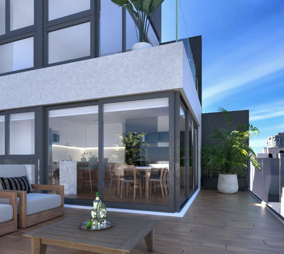 Muros rebocados con material tipo tarquini, simil piedra y detalles con buñas, balcones y barandas en vidrio para una mejor terminación y visual. Carpinteria exterior de aluminio esmaltada a horno color gris oscuro y cristales de seguridad para puertas y ventanas.